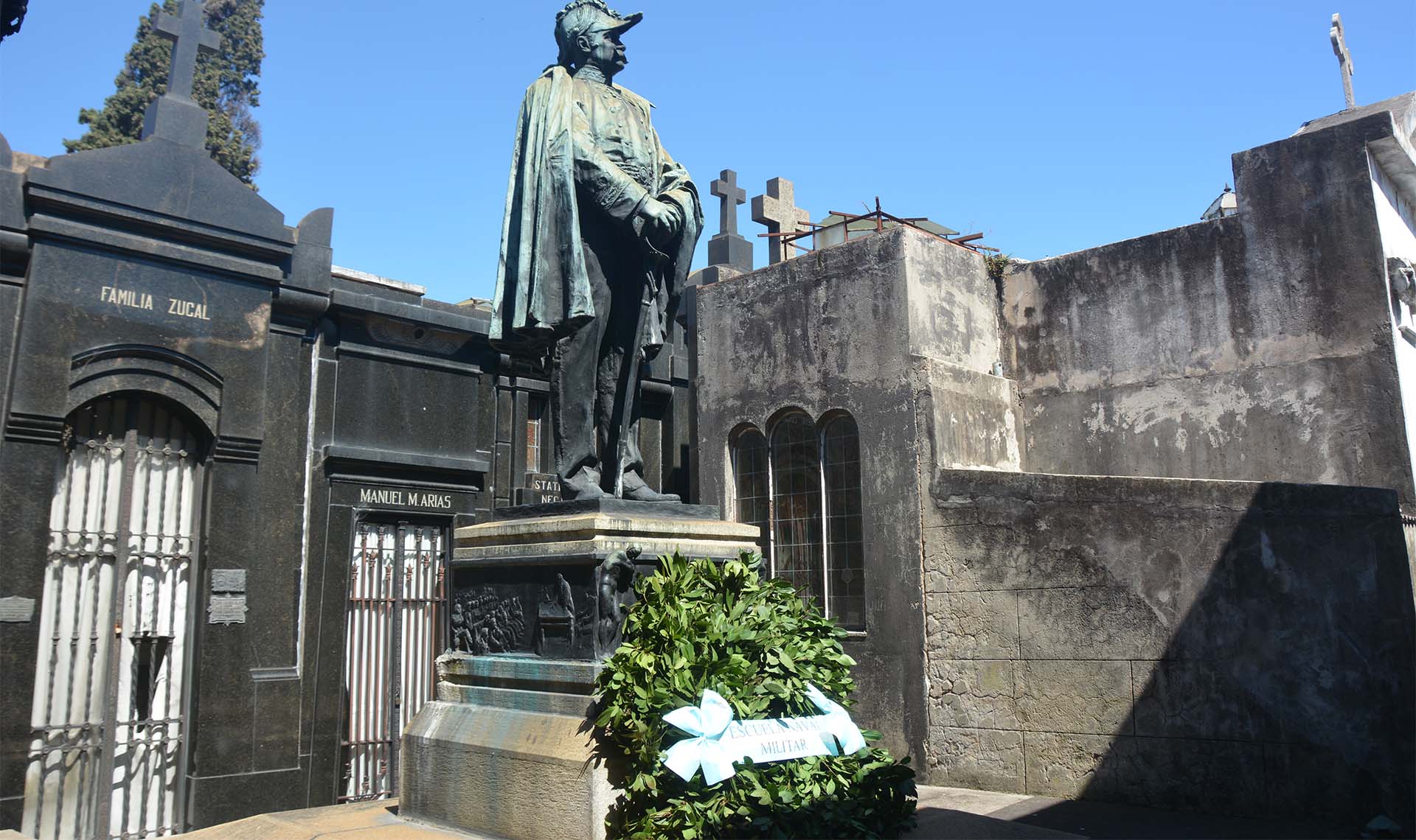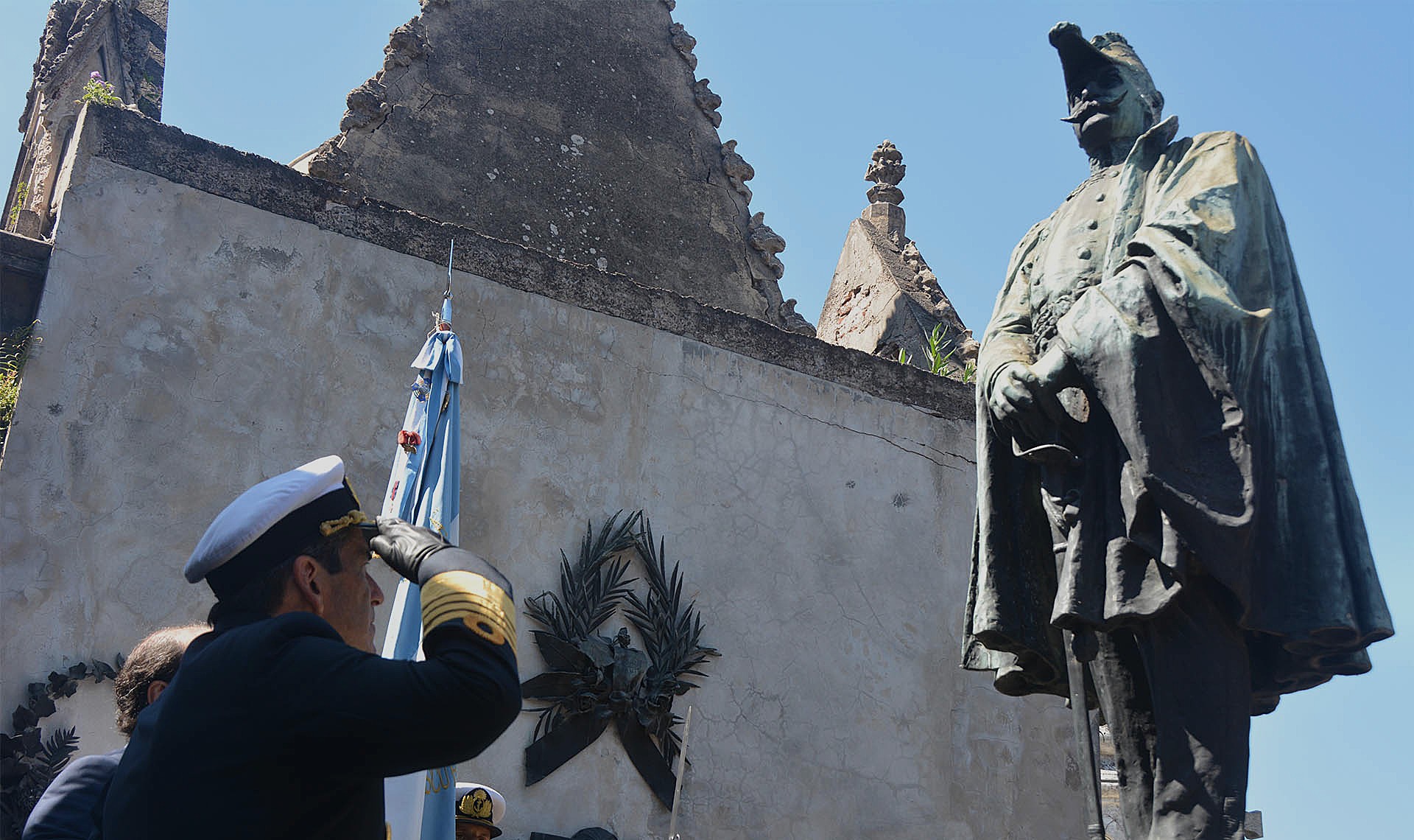 La ceremonia inició con la colocación de una palma de laureles al pie de una estatua que evoca al marino, junto a la bóveda que guarda los restos de su familia.