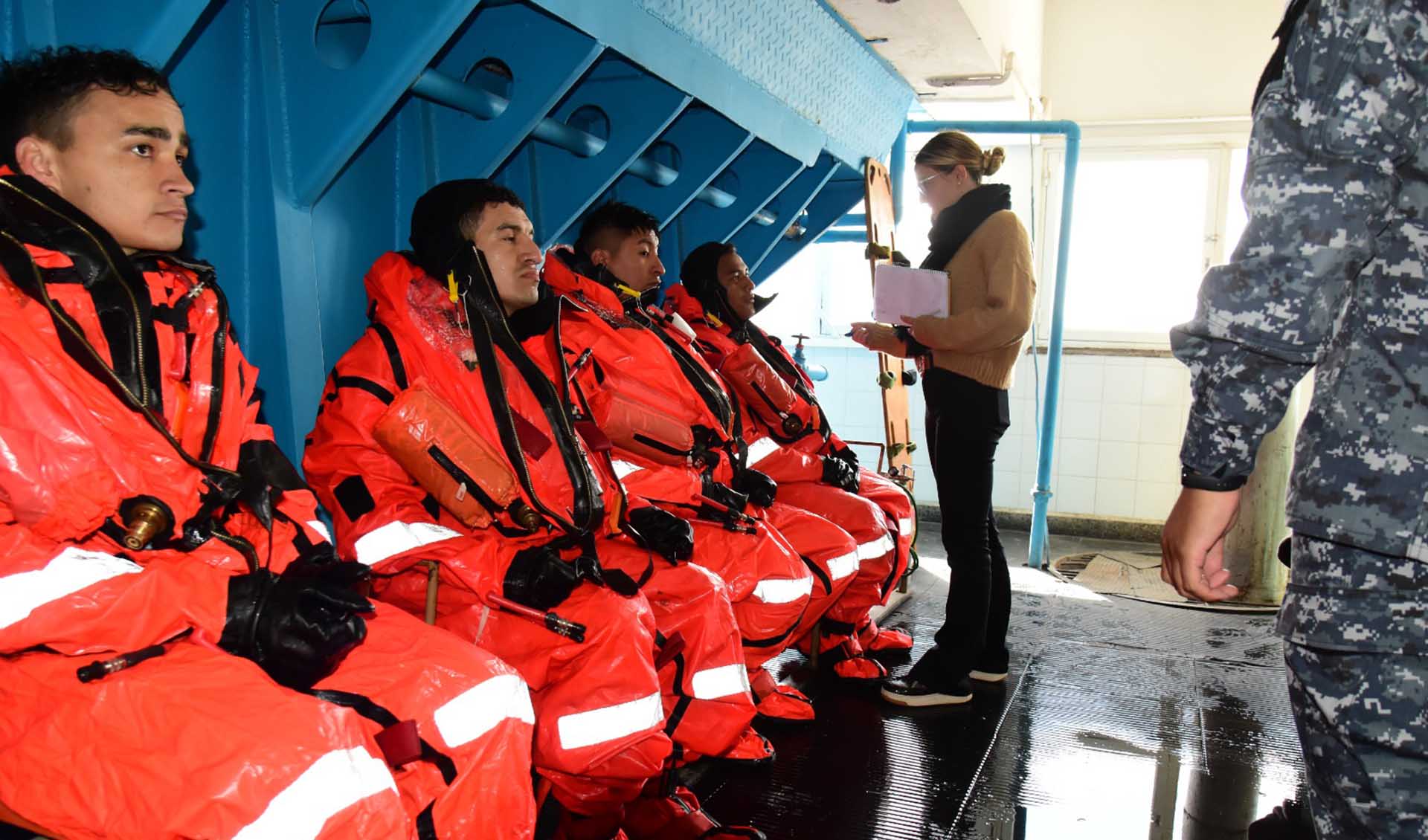 Finalmente, en la tercera fase la dotación llevó adelante el rol de abandono de la unidad. Allí se practicaron salto de borda desde cubierta, despliegue de balsas salvavidas, natación utilitaria realizando desplazamiento acuático grupal y técnicas de supervivencia en el mar, incluyendo el uso de señales pirotécnicas de marcación.
