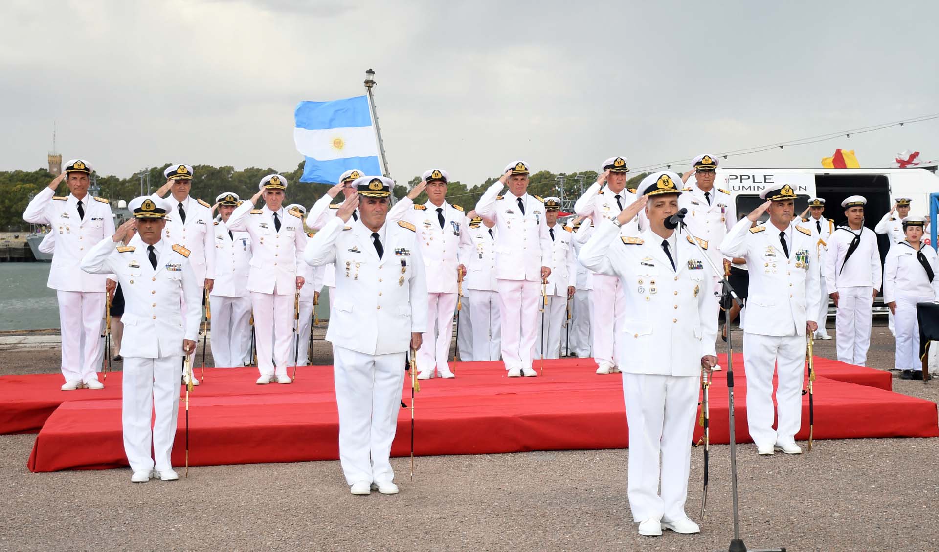 El acto fue presidido por el Jefe del Estado Mayor General de la Armada, Vicealmirante Juan Carlos Romay, quien estuvo acompañado por el Subjefe de la Armada, Contraalmirante Fernando Daniel Terribile, quienes ingresaron junto con los Comandantes saliente y entrante.