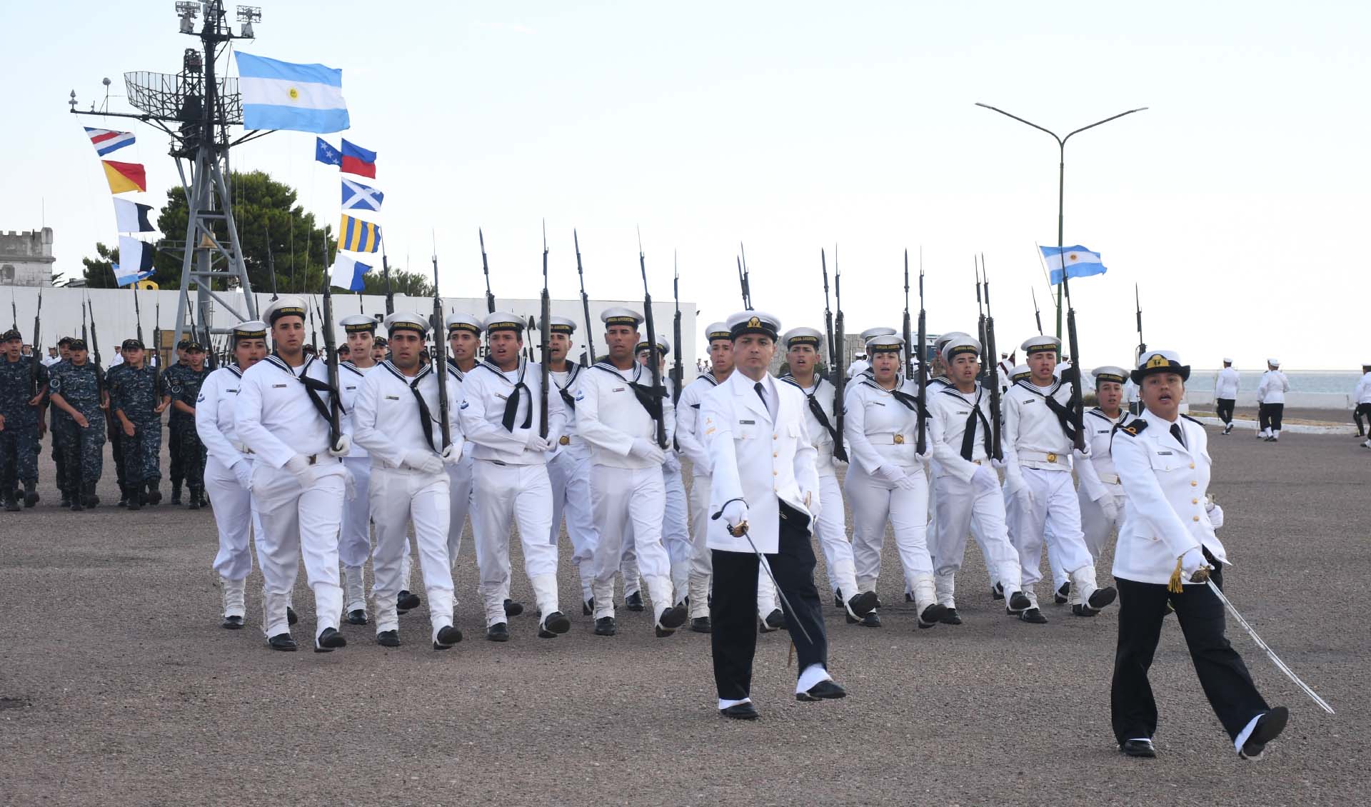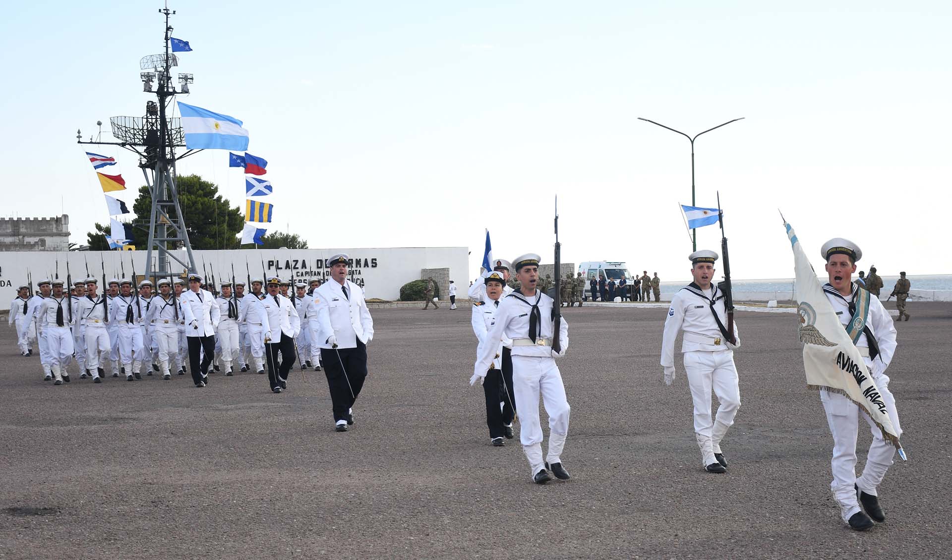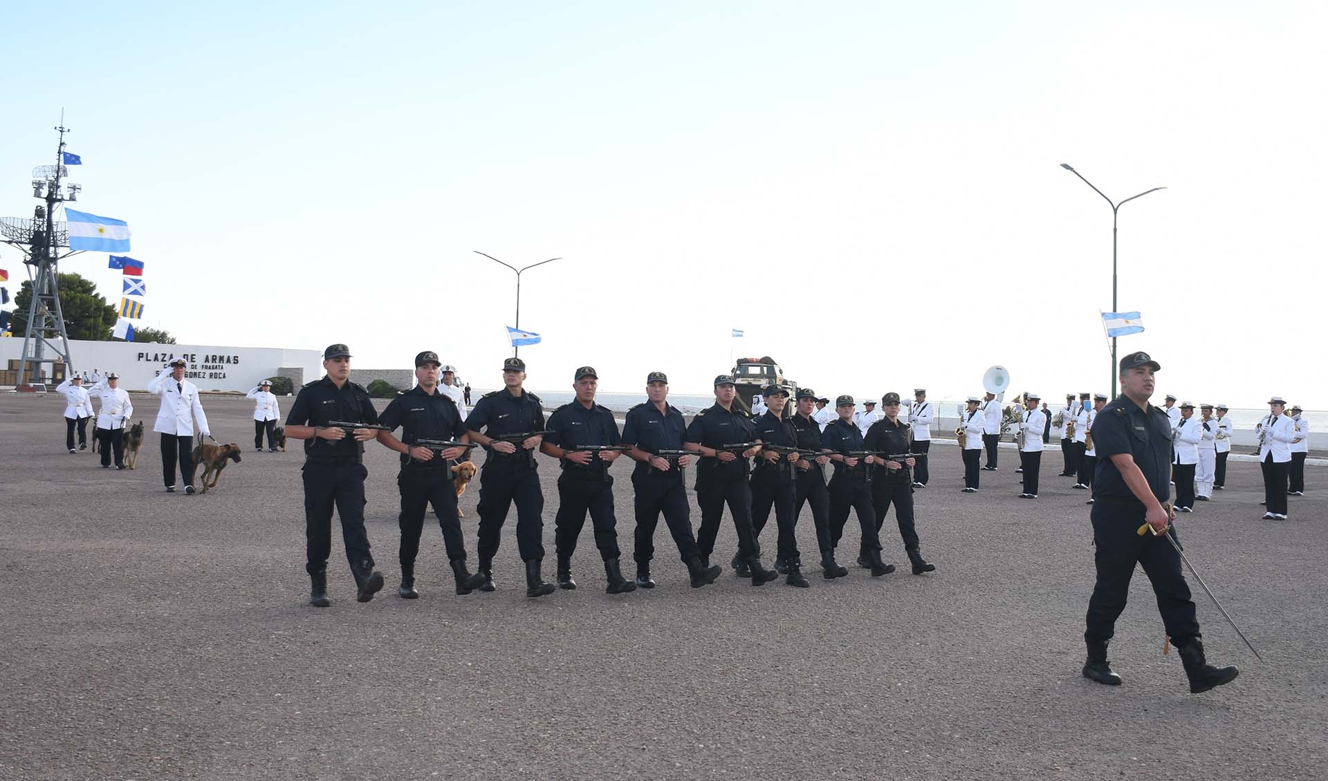 Luego de la incorporación de la Bandera de Guerra, el Jefe y Subjefe de la Armada, junto con los Contraalmirantes Lioi Pombo y Martí Garro, realizaron una revista al personal formado.