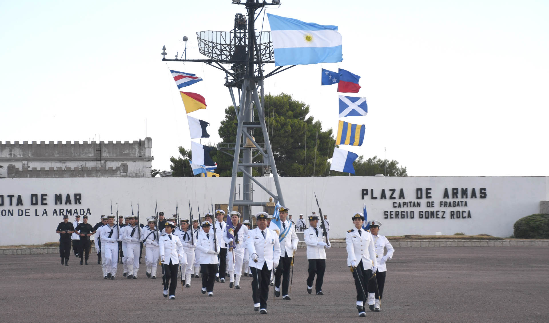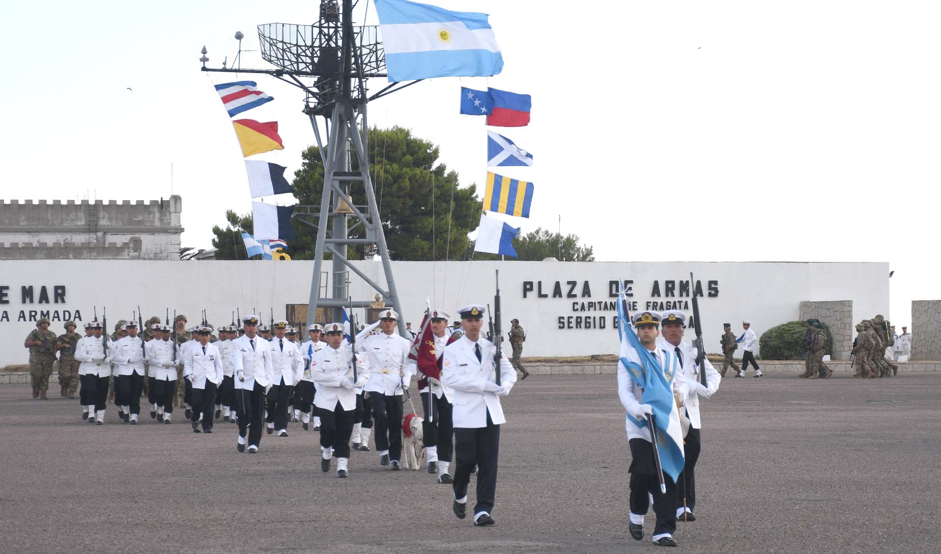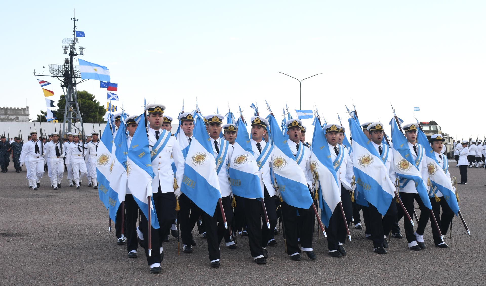 Luego de la incorporación de la Bandera de Guerra, el Jefe y Subjefe de la Armada, junto con los Contraalmirantes Lioi Pombo y Martí Garro, realizaron una revista al personal formado.