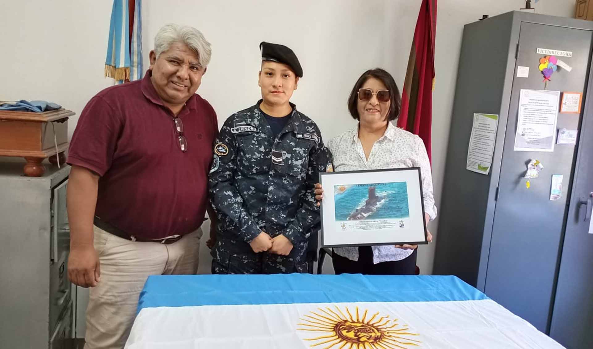 Durante la visita, la Cabo Liendro entregó un pabellón nacional para el mástil del establecimiento y un cuadro del submarino ARA "Salta" como símbolo del vínculo histórico y del compromiso permanente de la Armada Argentina con la educación y la comunidad.