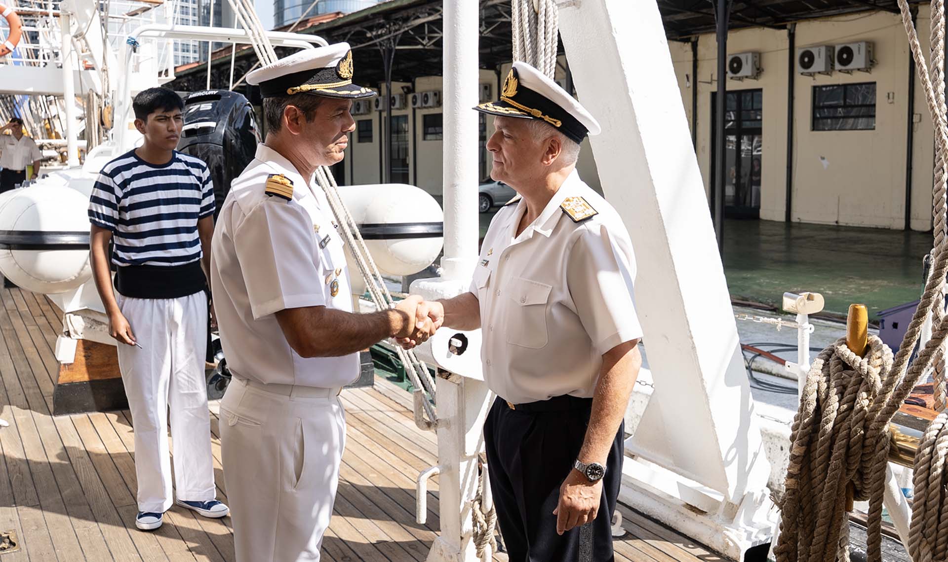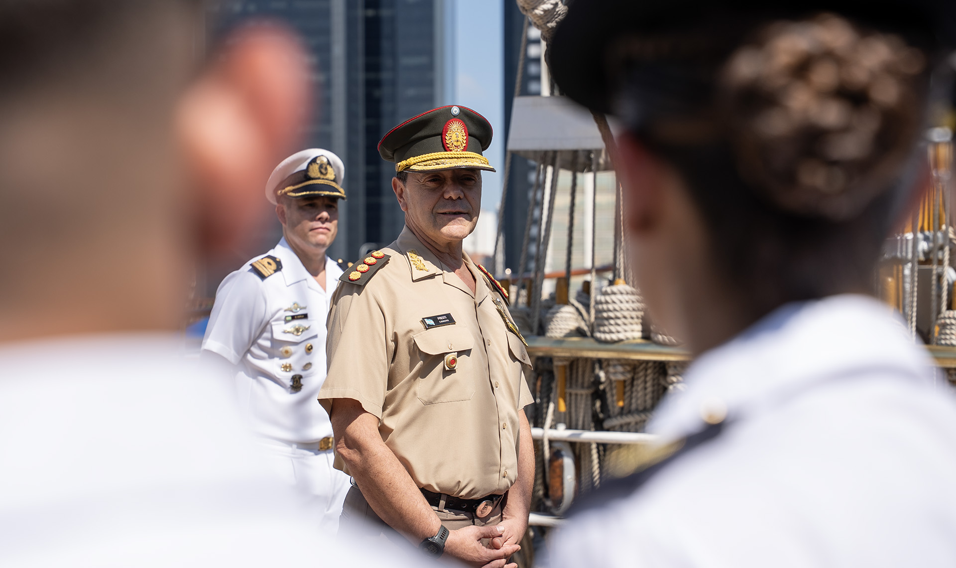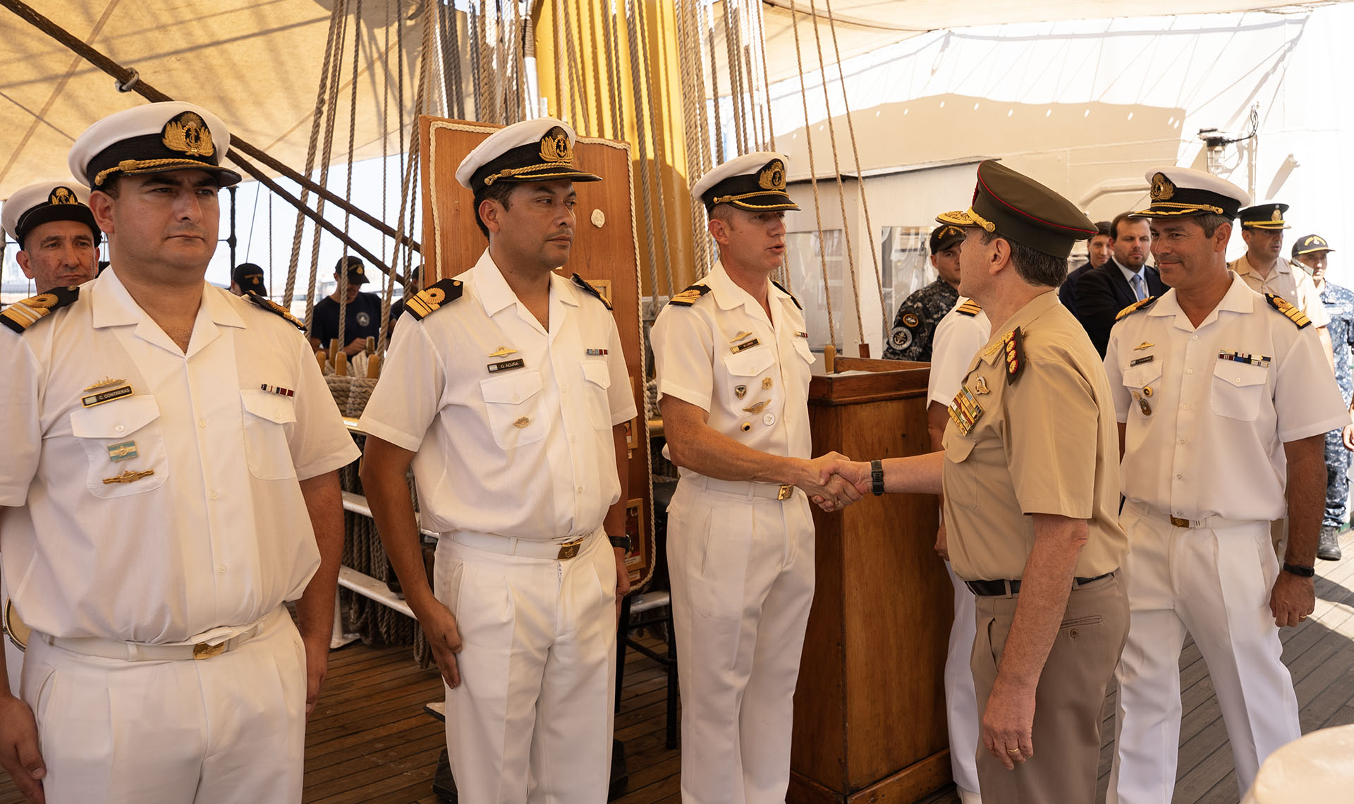Acompañados por el Comandante del buque escuela, Capitán de Navío Jorge Gabriel Cáceres, las autoridades saludaron en cubierta a los Guardiamarinas en Comisión.