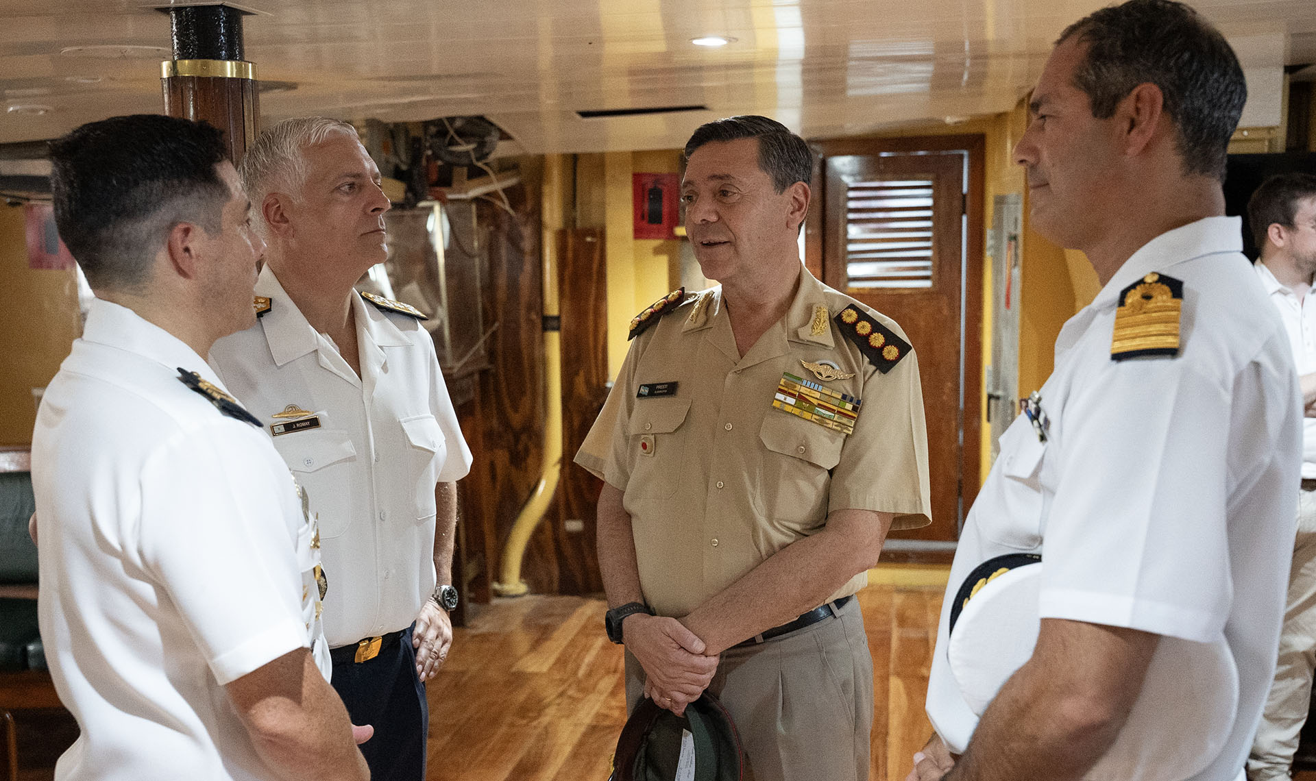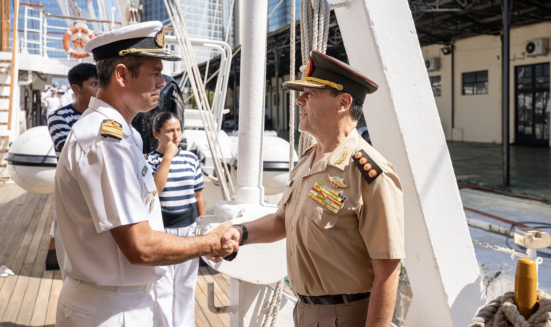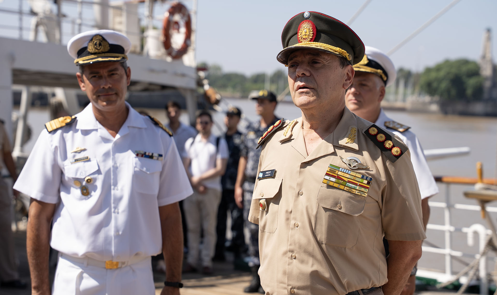 Acompañados por el Comandante del buque escuela, Capitán de Navío Jorge Gabriel Cáceres, las autoridades saludaron en cubierta a los Guardiamarinas en Comisión.