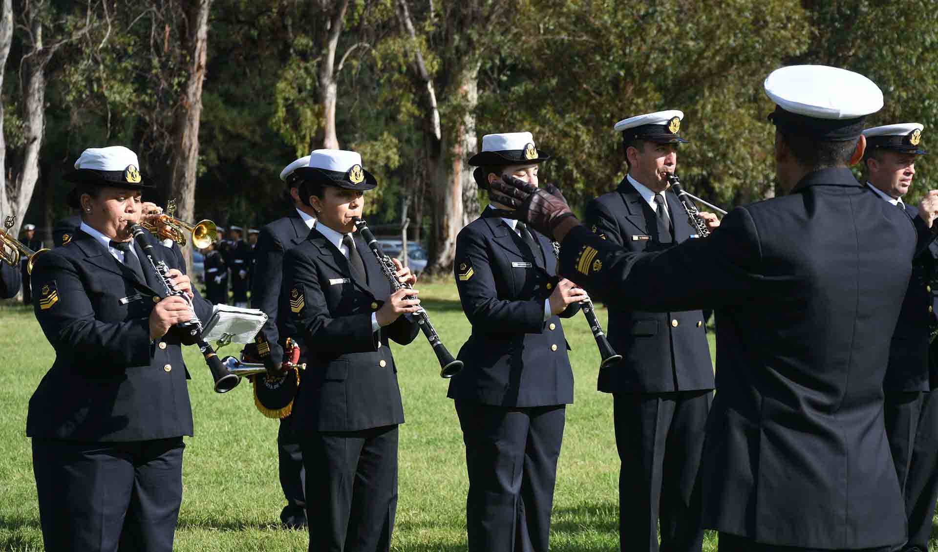 El ingreso de la Bandera de Guerra del Comando de Adiestramiento y Alistamiento de la Armada marcó el inicio de la ceremonia, que continuó con la entonación de las estrofas del Himno Nacional Argentino ejecutado por la Banda de Música de la BNPB.