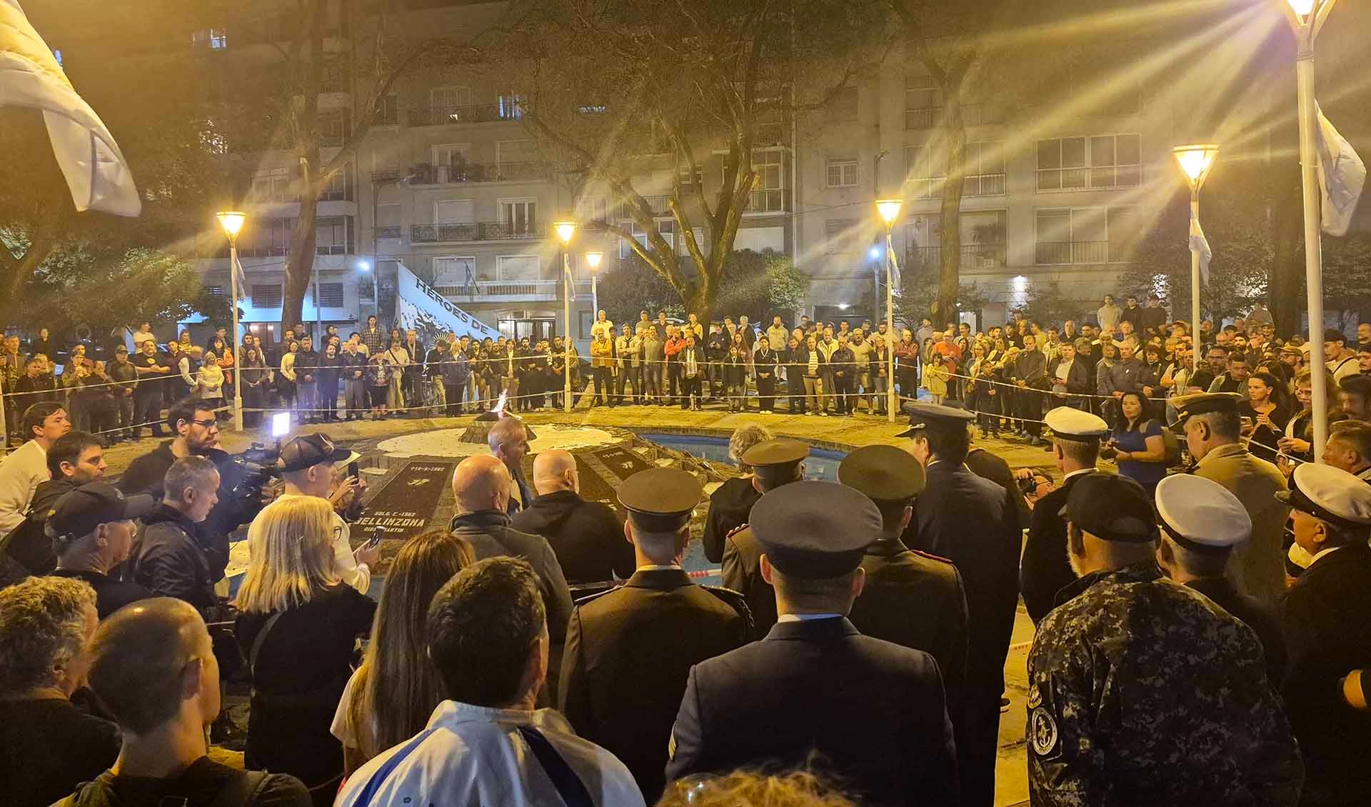 Más tarde, se trasladaron a la Plazoleta “Islas Malvinas” que recuerda a los caídos de la ciudad en la guerra. A la medianoche, se ejecutó un Minuto de Silencio y los presentes entonaron las estrofas del Himno Nacional Argentino.
