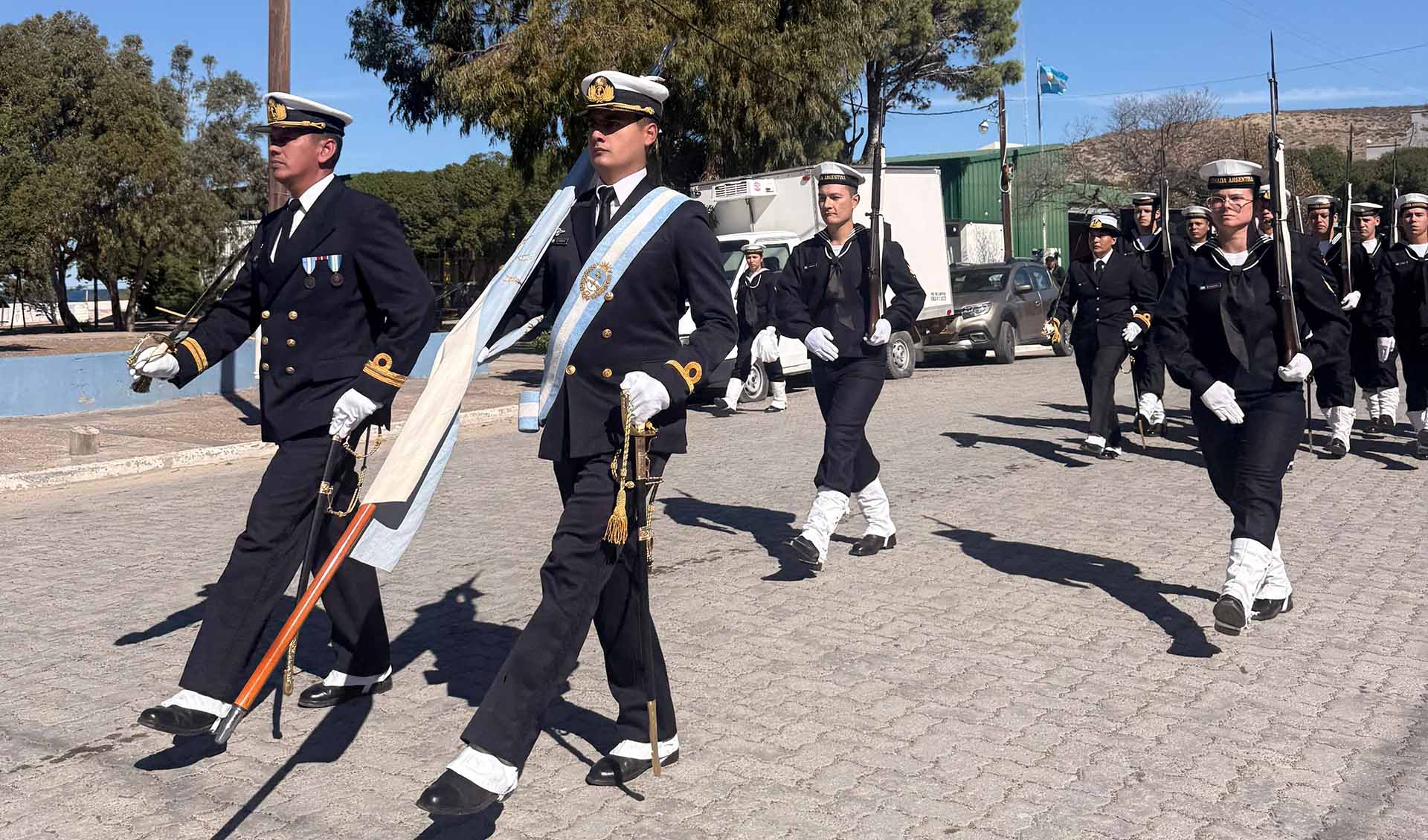 Las actividades en Rawson fueron encabezadas por el Intendente local, Damián Biss, junto a representantes del Poder Ejecutivo y Legislativo, de Fuerzas de Seguridad, Veteranos de Guerra, familiares de caídos y vecinos. Por la Armada Argentina estuvo presente el Jefe de la BAAZ, Capitán de Fragata Pablo Viozzi, el Subjefe del Taller Aeronaval Almirante Zar, Capitán de Fragata Pablo Lavena, y se destacó a un grupo de desfile de la FAE3 a cargo del Teniente de Fragata Mauro Guerrero Burgos.