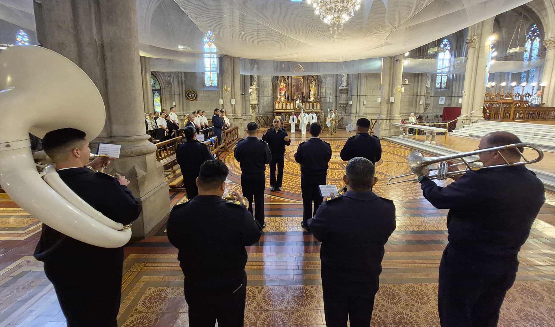 La Banda de Música del Área Naval Atlántica acompañó la ceremonia con acordes solemnes que dieron un marco de respeto y recogimiento a cada momento litúrgico, especialmente durante la invocación final y la oración por los caídos.