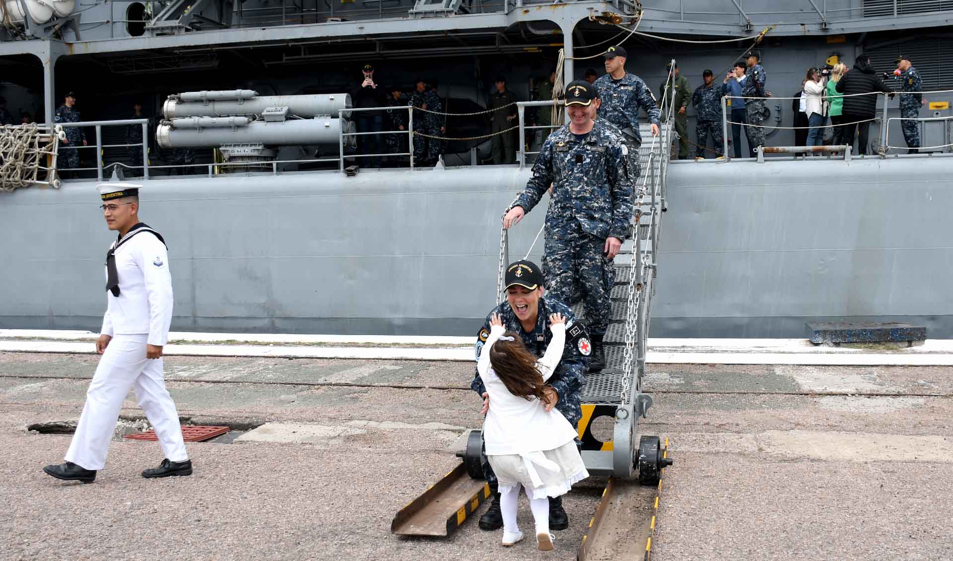Luego de tomar amarras, las autoridades subieron la planchada para participar de un breve acto realizado en la cubierta de vuelo. Allí se dio lectura a las palabras que el Jefe del Estado Mayor General de la Armada oficializó en el documento de arribo, a fin de reconocer la tarea realizada por el personal durante el operativo multinacional. A continuación, la dotación desembarcó para reencontrarse con sus afectos luego de más de 80 días en el mar.