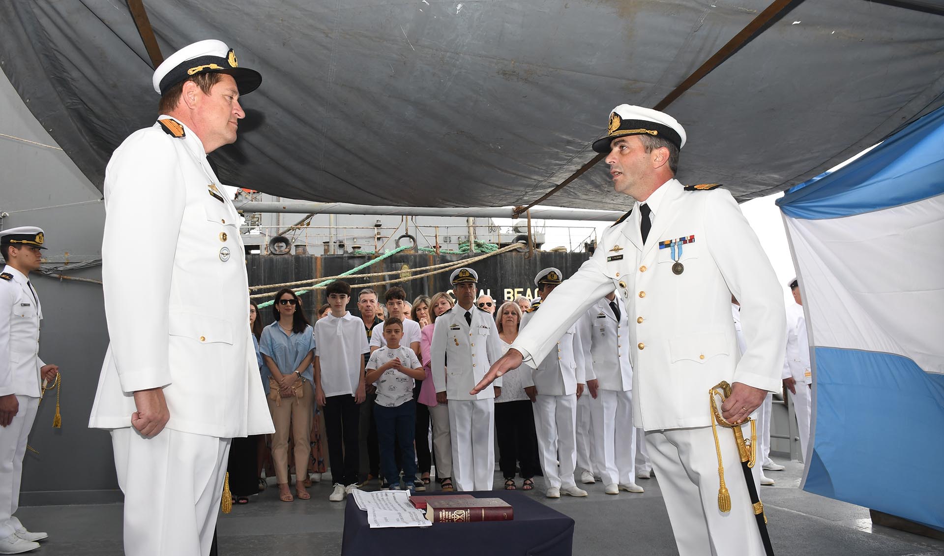 El acto estuvo presidido por el Comandante Naval, Anfibio y Logístico, Capitán de Navío Fernando Pablo González, quien estuvo acompañado por los comandantes entrante y saliente, por la dotación del buque, familiares e invitados especiales.