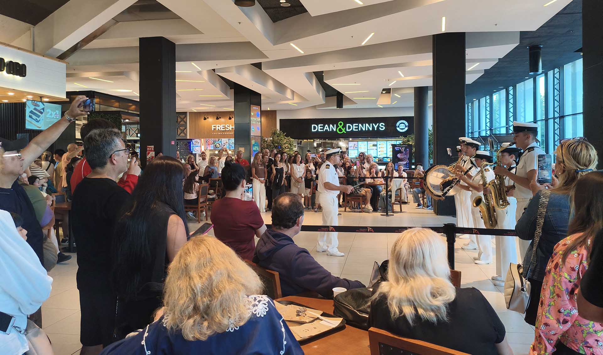 La presentación comenzó en el Patio de Comidas y luego los músicos navales se trasladaron a Planta Baja, donde nuevamente desfilaron hacia el hall de entrada. Allí, a cargo del Director de Banda, Teniente de Fragata Marcos Vicente Exequiel Rodríguez, continuaron ejecutando su repertorio de marchas militares y música popular con instrumentos de viento-metal, viento-madera y percusión.