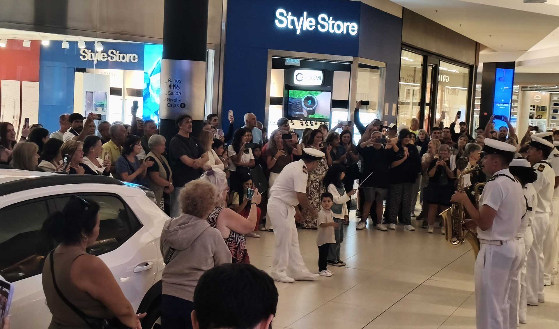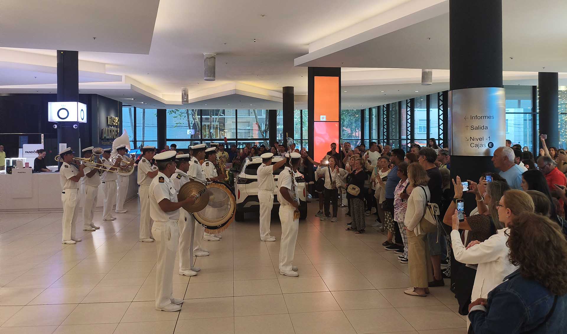 Ayer por la tarde, quienes estaban paseando por este reconocido centro comercial ubicado en el centro de la ciudad, lugar de encuentro de marplatenses y turistas, se sorprendieron cuando empezaron a sonar los acordes y vieron desfilar por el 1° piso a los músicos de la Armada Argentina.