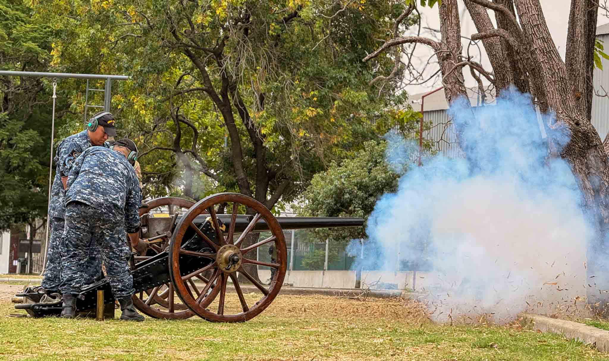 A continuación, integrantes de la guardia efectuaron disparos en honor al Padre de la Armada, seguidos por cuatro cañonazos de salva. Finalmente, y como es tradición, la Banda de Música del Estado Mayor General de la Armada interpretó la Marcha de San Patricio y la Marcha de la Armada.