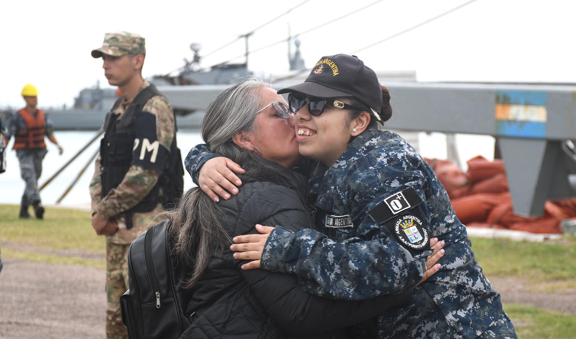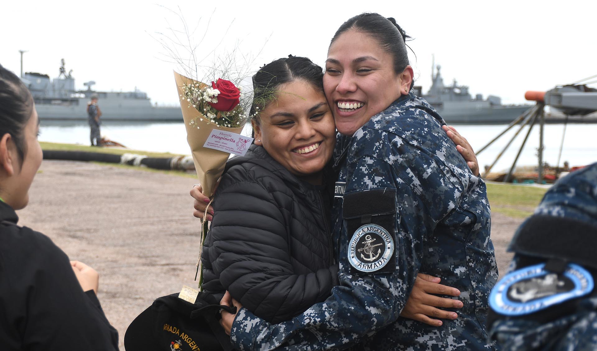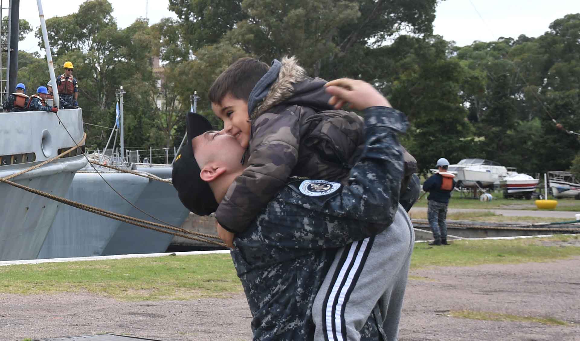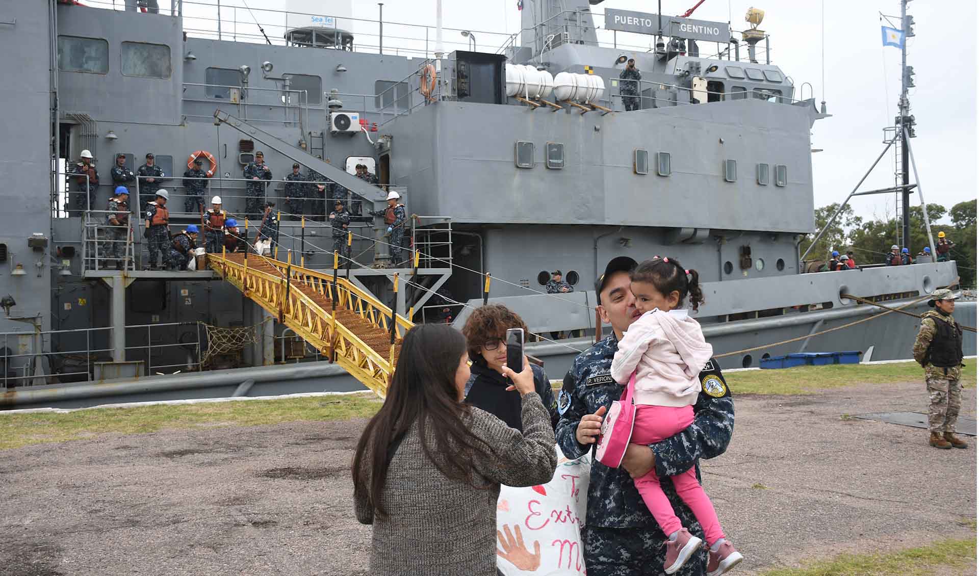 "Te amamos, papá" y "Bienvenida, mamá" fueron el denominador común de las pancartas y carteles que desplegaron los familiares de los 70 tripulantes del aviso en la dársena, mientras el "Puerto Argentino" tomaba amarras en su apostadero habitual de la Base Naval Puerto Belgrano (BNPB).