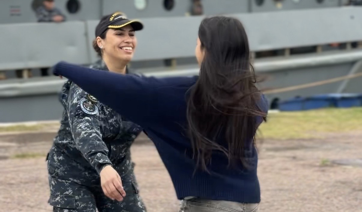 El anhelado abrazo llegó luego de que la dotación descendió por la planchada hacia el reencuentro familiar, al compás de la Marcha de la Armada ejecutada por la Banda de Música de la BNPB.